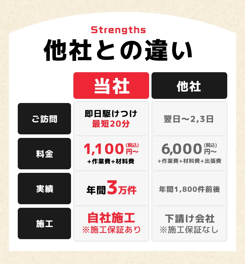 - 当社では保険への加入、無料の保証制度、3日以内の再発は無料修理を導入しています。